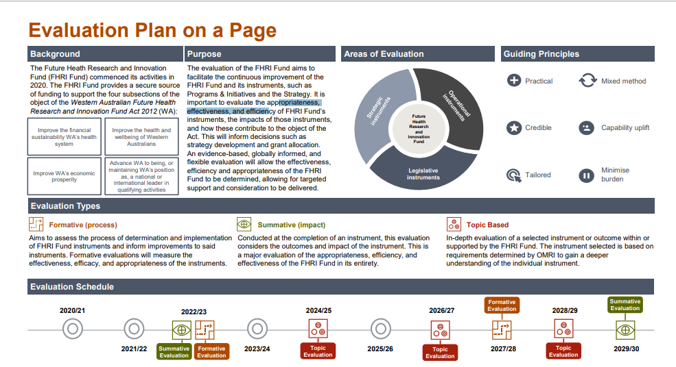 The Evaluation Plan spans 10 years from the operational commencement of the FHRI Fund in 2019-20 through to 2029-30. The Evaluation Plan is designed, but not limited, to evaluate the FHRI Fund instruments.