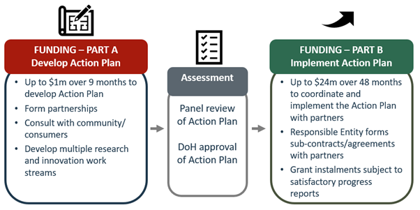The Action Plan developed during Part A will be reviewed by the Grant Review Panel and approved by the Department of Health (DoH) before implementation funding (up to $24 million) is released.
