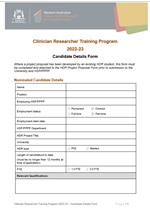 If a project proposal developed by an existing HDR student is submitted to a Health Service Provider (HSP) / public-private partnership provider (PPPP), a Candidate Details Form must be provided with the HDR Project Proposal Form to inform the HSP/PPPP project selection process. The Candidate Details Form must include certification from the relevant university that there are no IP claims to the project from anyone other than the candidate and that a due selection process was followed by the university in accordance with their terms and conditions. If the project is selected by an HSP/PPPP, the existing HDR student associated with the selected project would be the nominated candidate for the CRT scholarship.