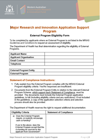 MRIAS applicants were required to be at the full application stage of the relevant External Program (i.e. not the Expression of Interest stage) and intending to apply to the External Program within twelve months from the closing date for the MRIAS round.