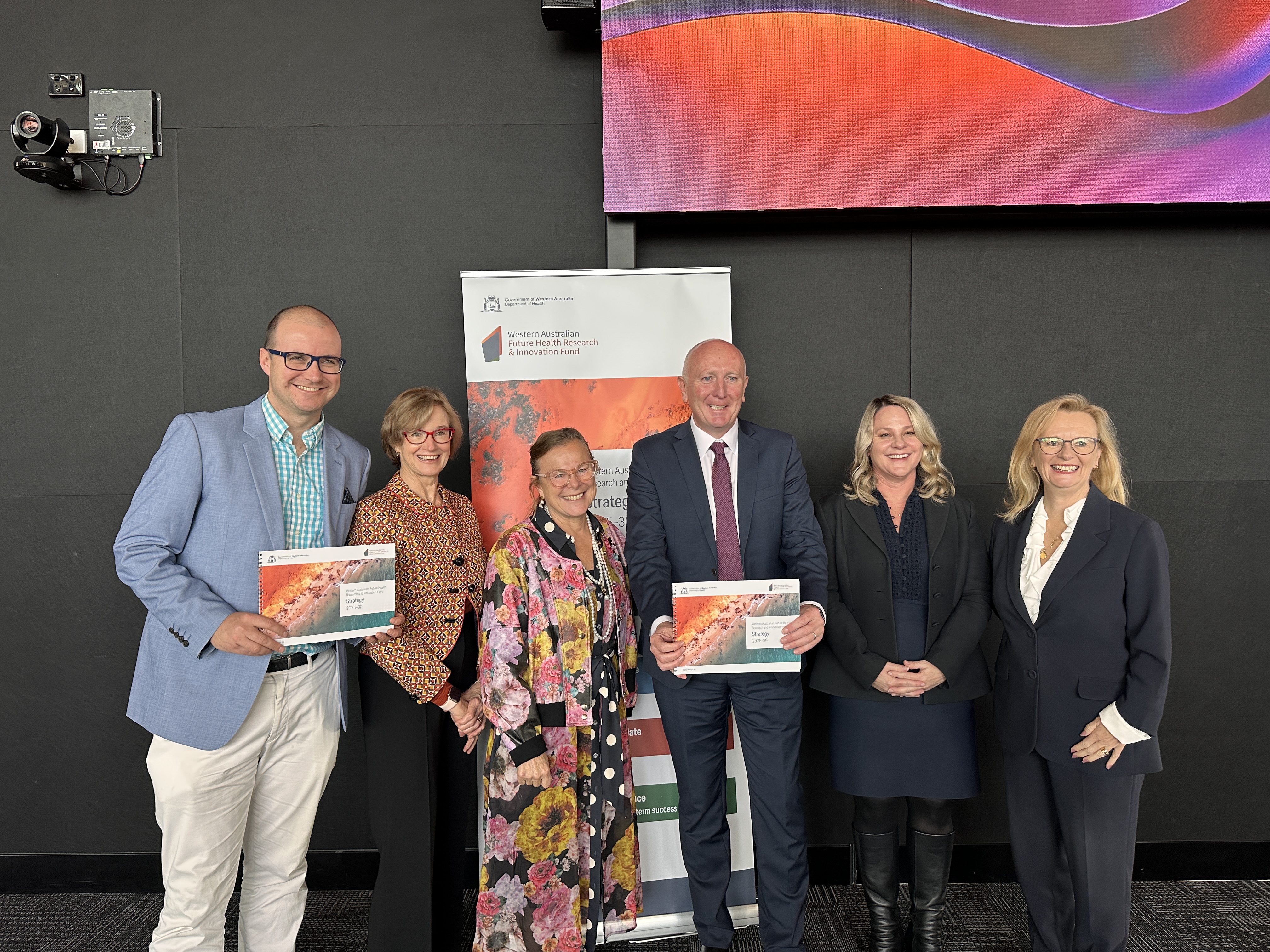 At the launch of the FHRI Fund Strategy are: (L to R): Kane Blackman (Advisory Council member), Jennifer Lawrence (Advisory Council member), Professor Fiona Wood (Advisory Council member), Hon. Stephen Dawson MLA, Rebecca Tomkinson (Advisory Council Chair) and Dr Shirley Bowen (Director General, Department of Health).